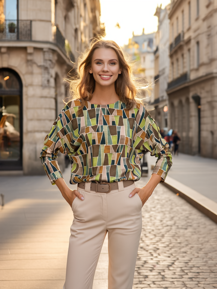 Das markante geometrische Muster verleiht dem Outfit einen lebendigen und interessanten Charakter, während der neutrale Schnitt eine einfache Kombination mit verschiedenen Hosen oder Röcken ermöglicht.